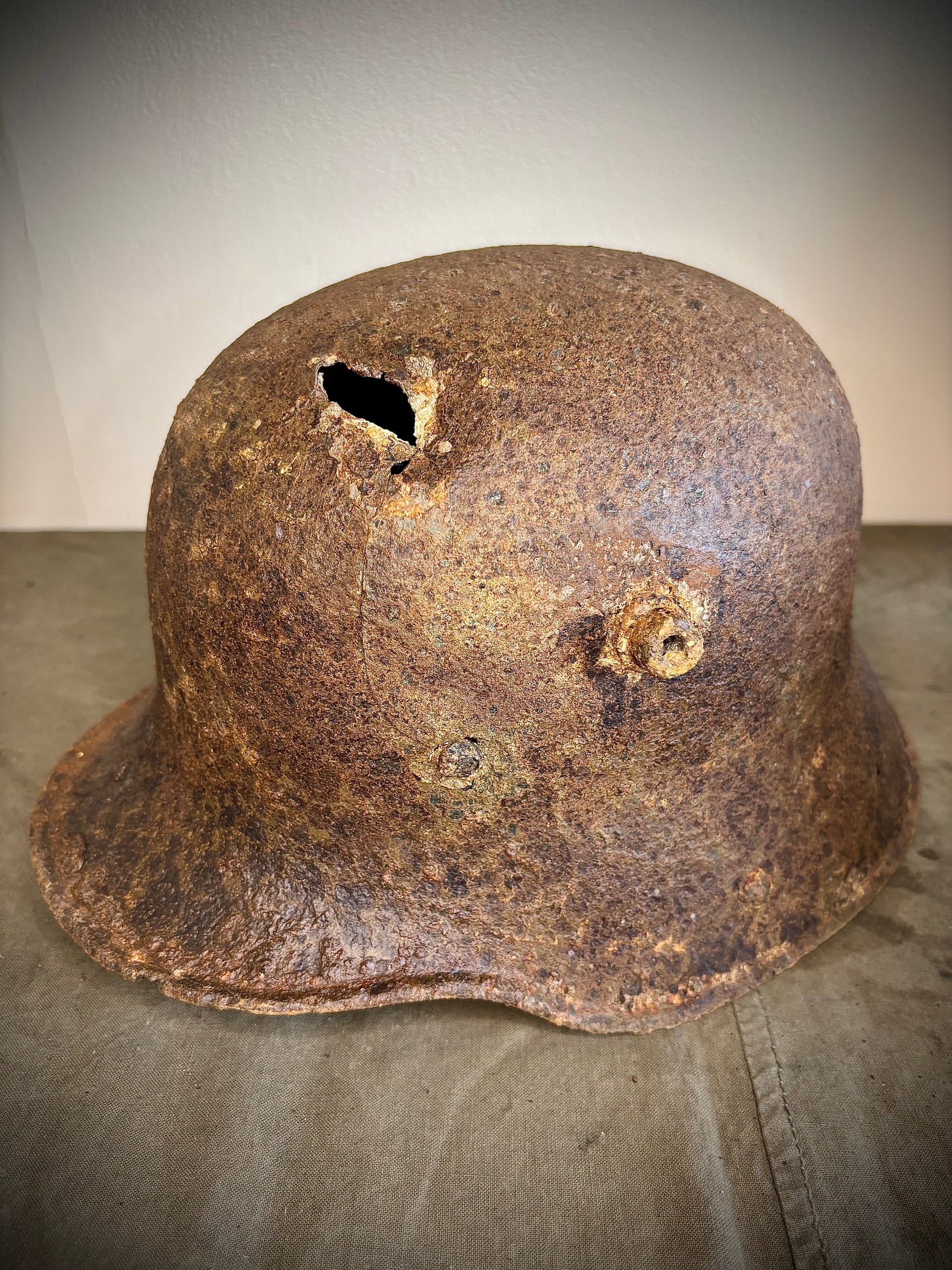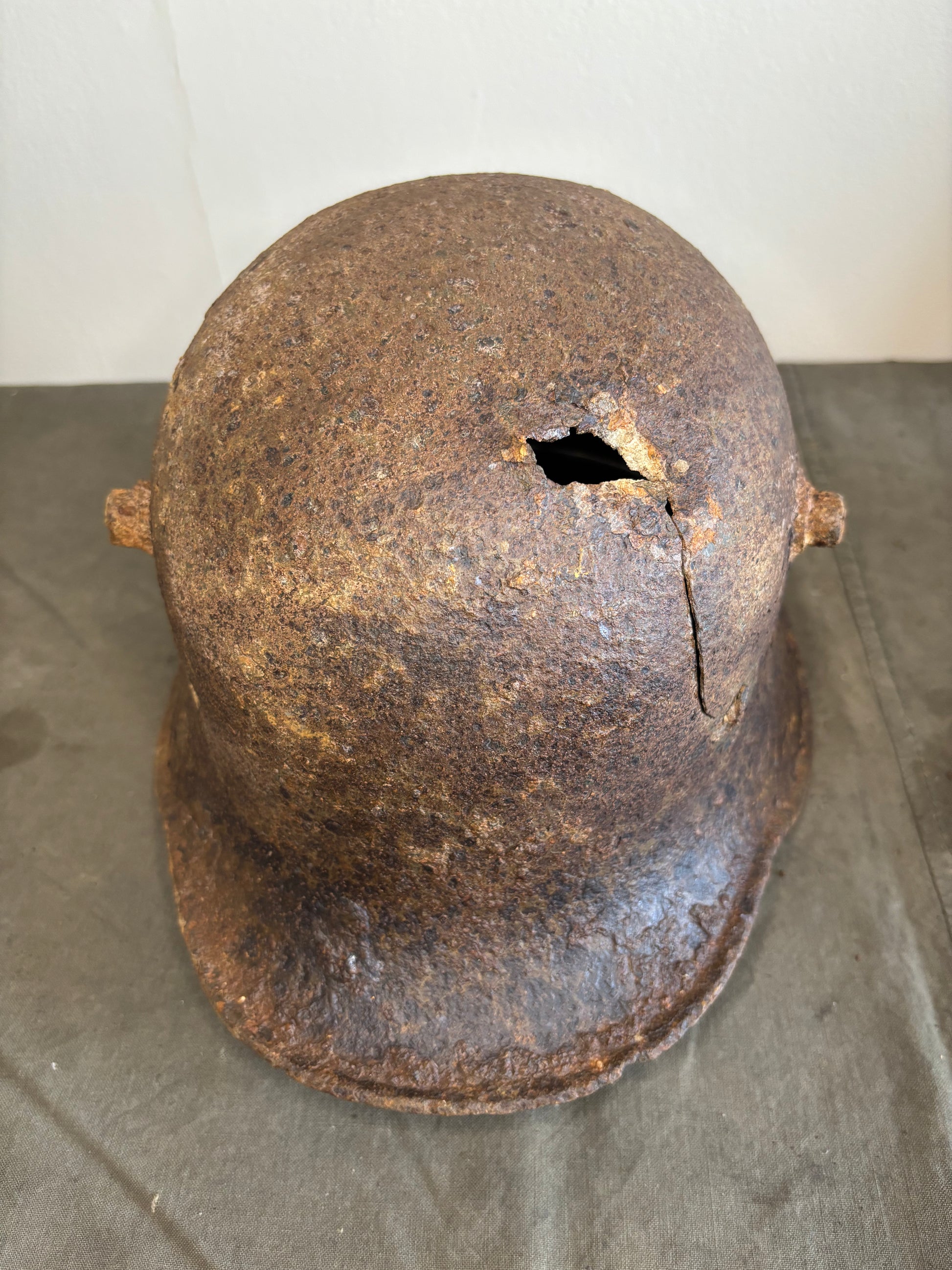 This lovely relic was found by a local collector in the Somme. As you can see the helmet has suffered a fairly large shrapnel hole to the top however the rest of the helmet is nice and solid. Inside there is plenty of original paint which is surprising to see after 100 years in the ground.