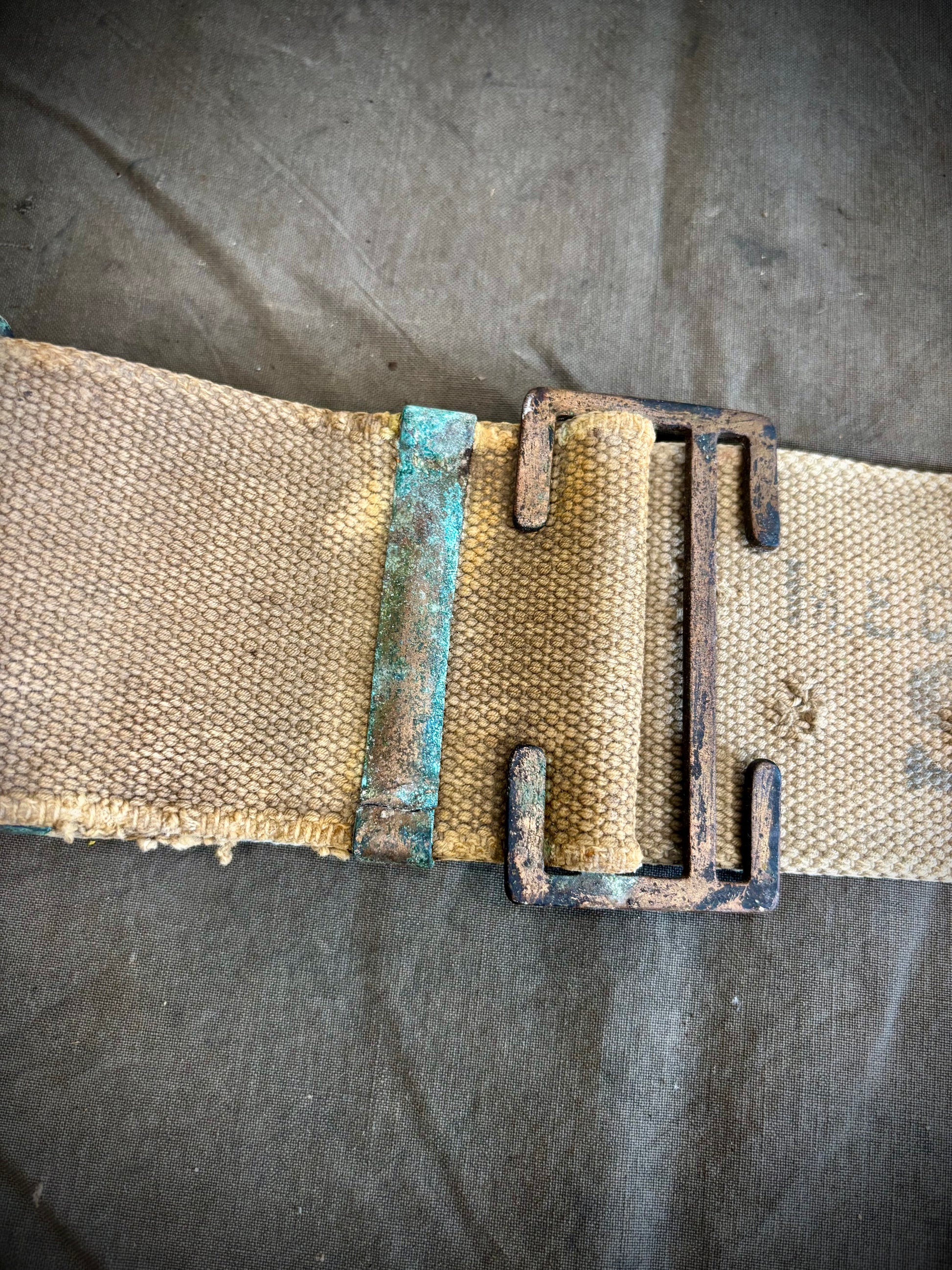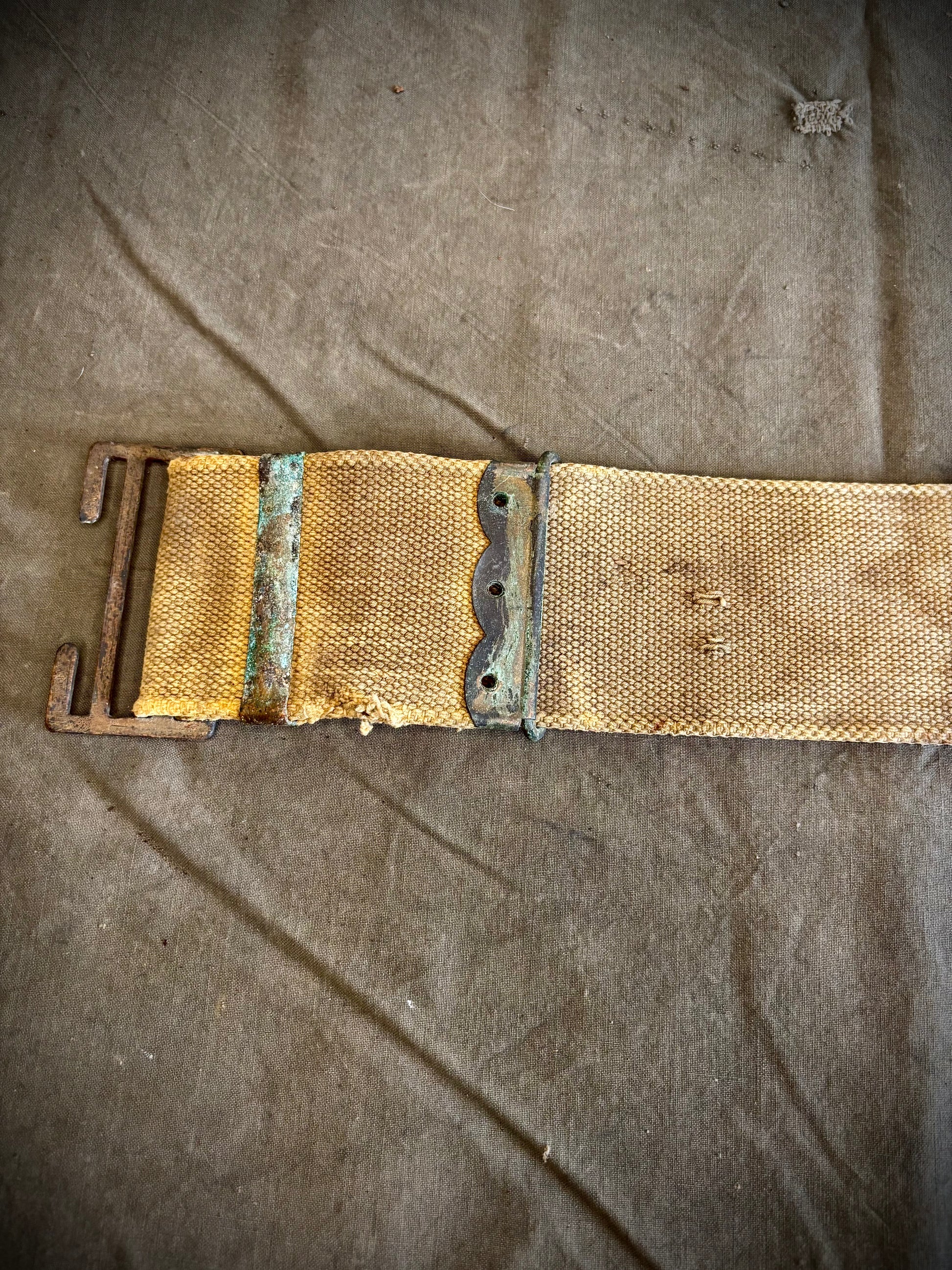 WW1 British 1908 pattern belt that looks to have been found in a barn or loft after the war. The belt is stamped 1916 and made by ME CO who were a large supplier of webbing equipment during WW1. Overall the belt is in classic loft/ barn find condition with staining, fraying a oxidised buckles but this was there and is a silent witness of battle.