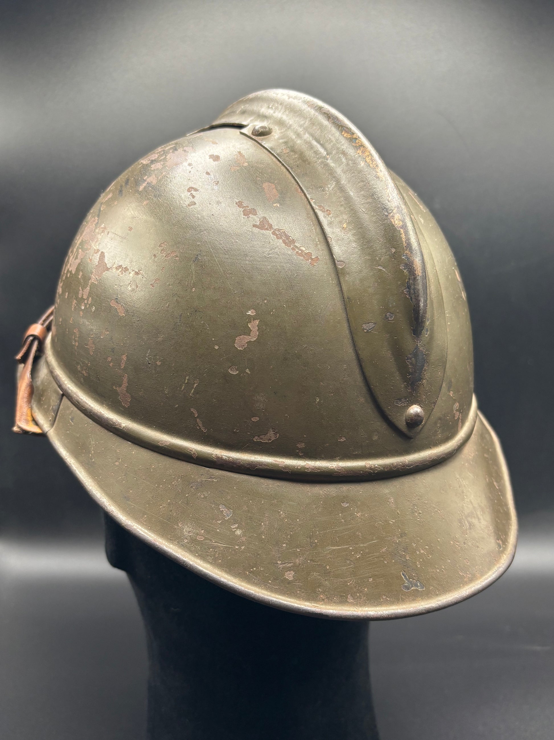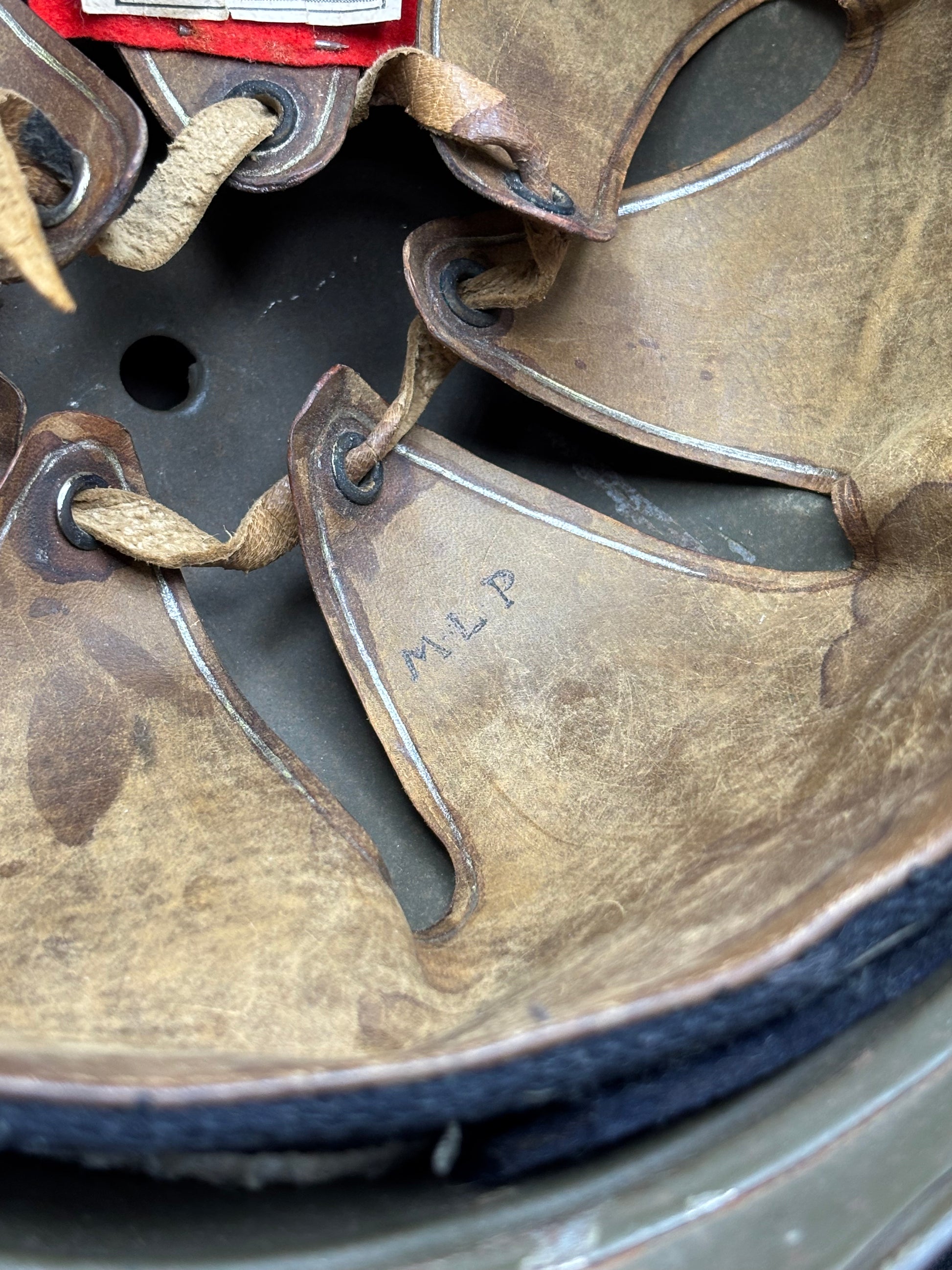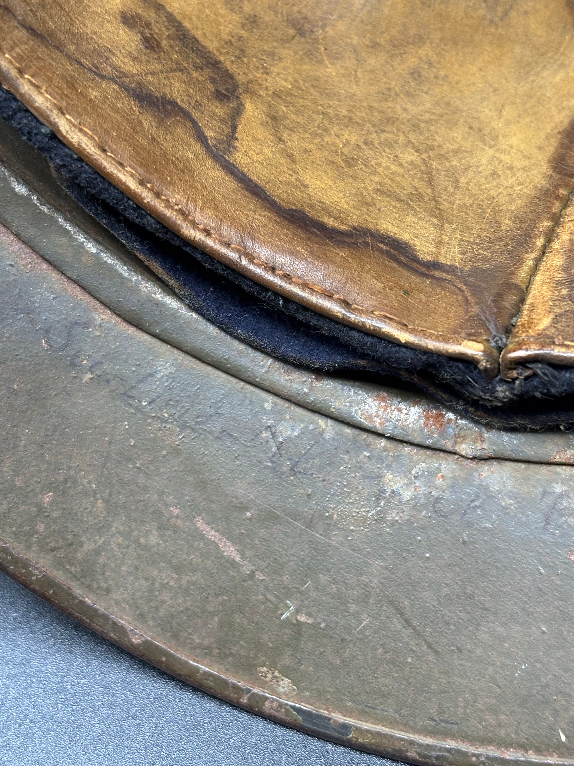The helmet itself is in lovely front line used condition. The outer shell has most of its original pain with some scratches around the whole helmet which is typical and expected. Furthermore the chinstrap is in amazing condition and is not dry or flaking like many similar leatherwork of that period. Inside the helmet the liner again is in amazing condition with signs of use.
