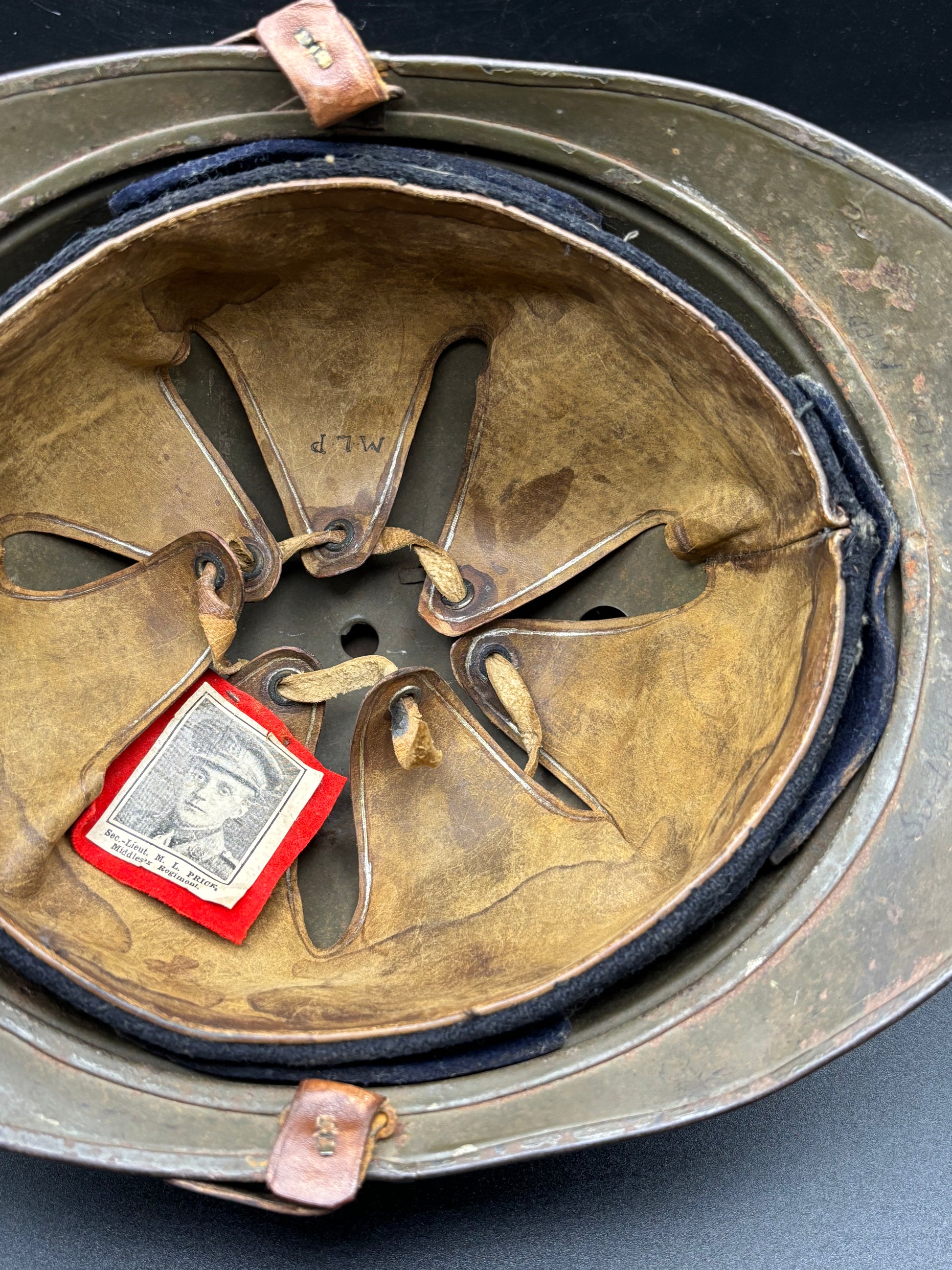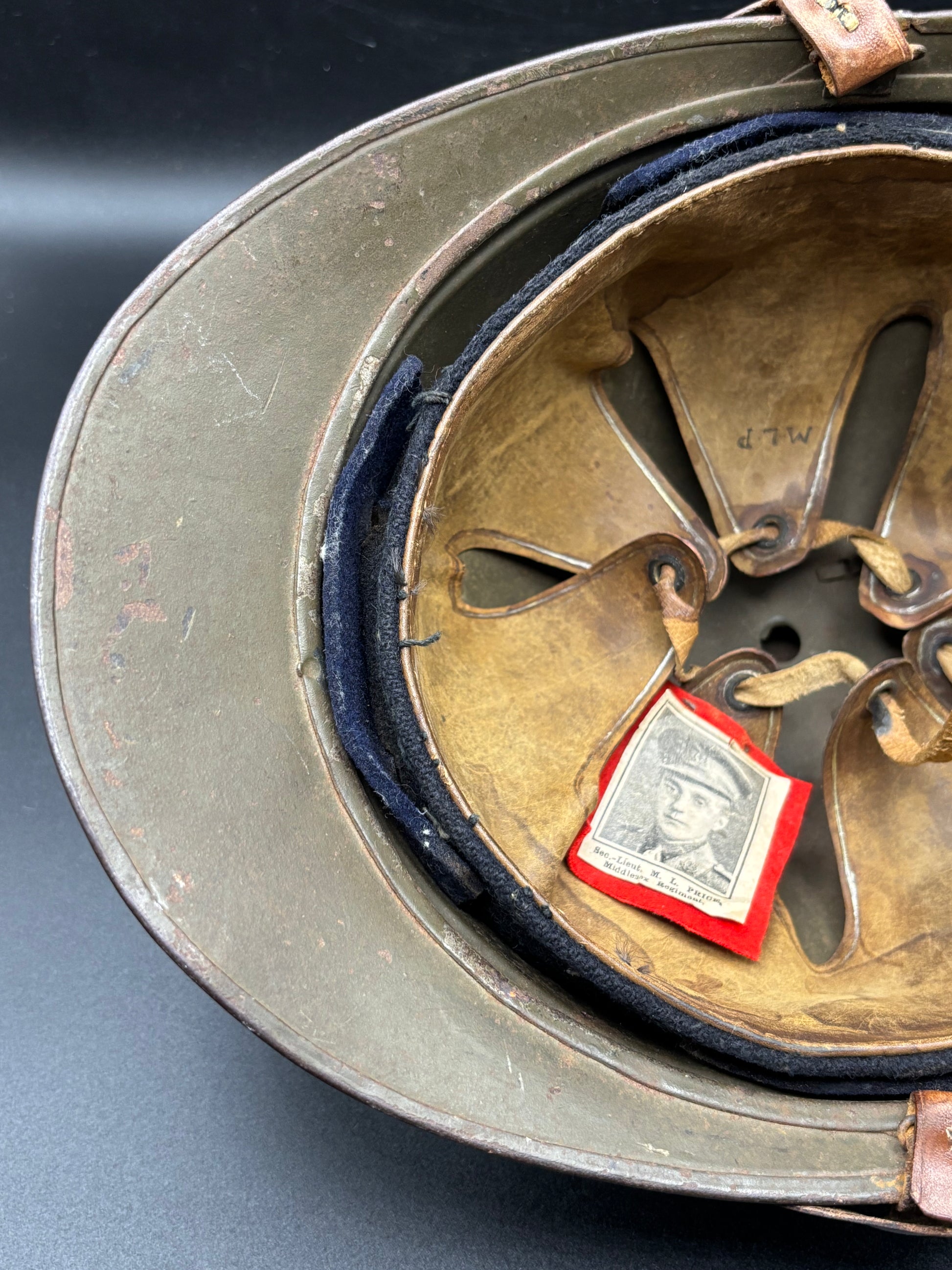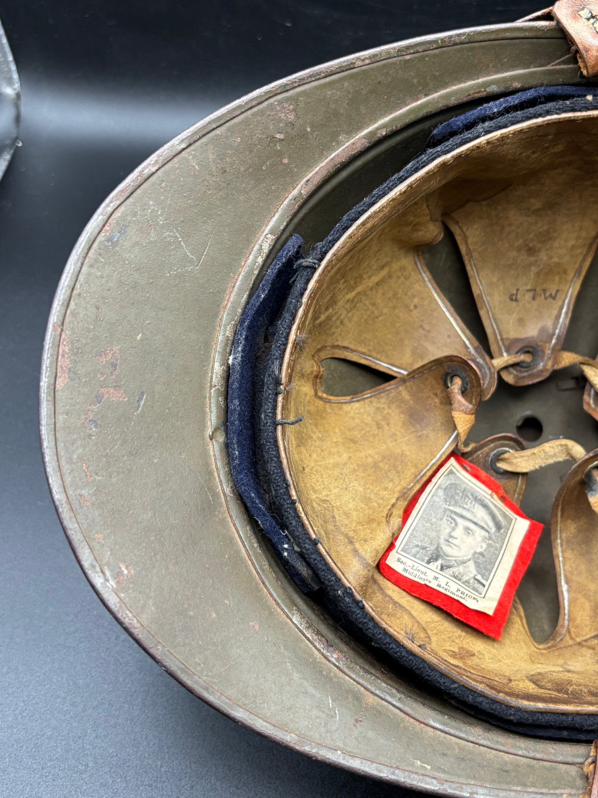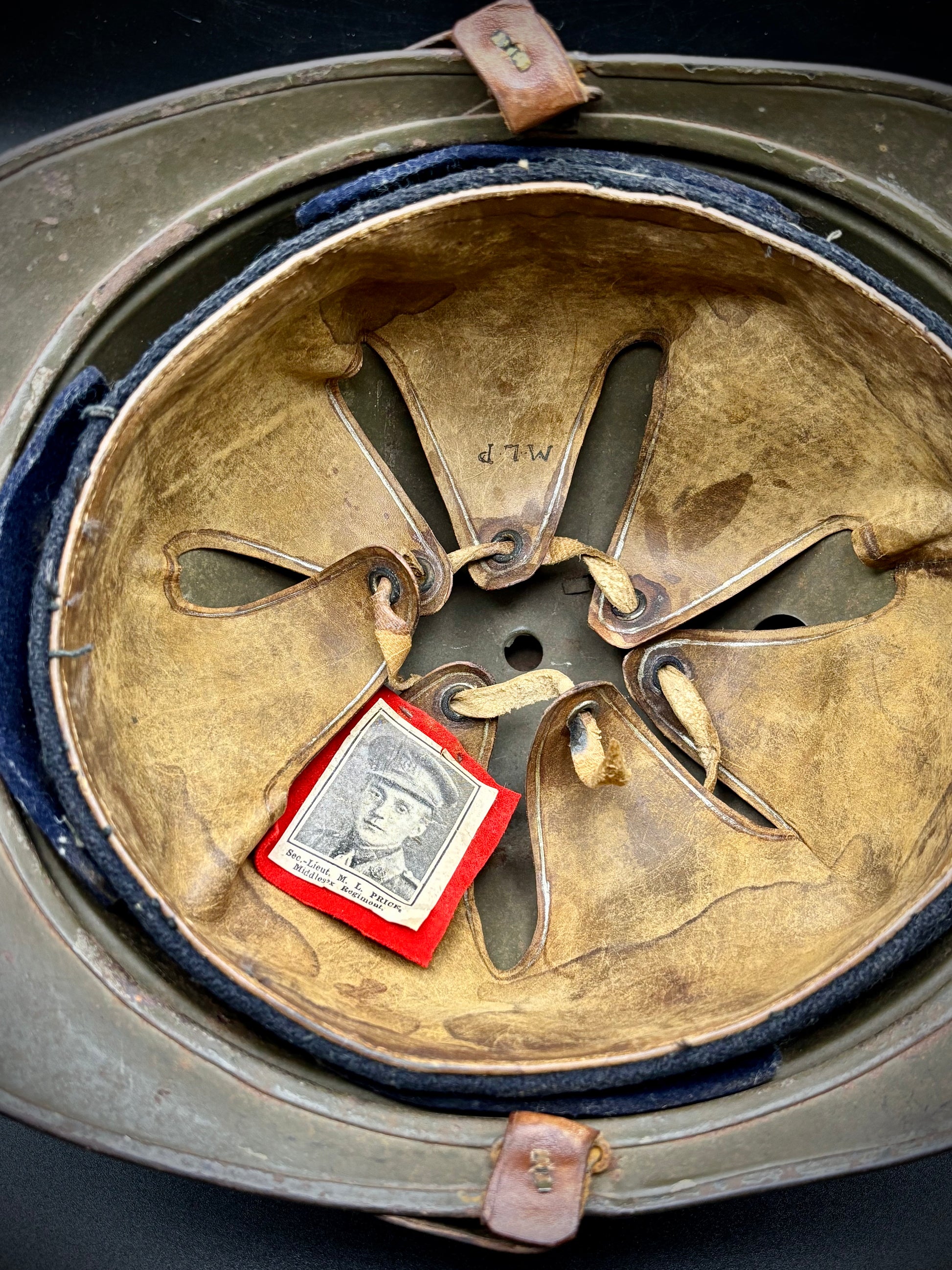 What is the best aspect of the helmet is the small inscription on the rear brim. It says 'Second Lieutenant M L Price 7th Battalion Middlesex'. With some deep diving into my books I have discovered that the helmet belonged to 2nd Lt. Montagu Leonard Price, 1/7th Middlesex Regt., died on Monday, 26th June 1916, aged 22. He is buried in Hebuterne Military Cemetery, grave II.M.7.