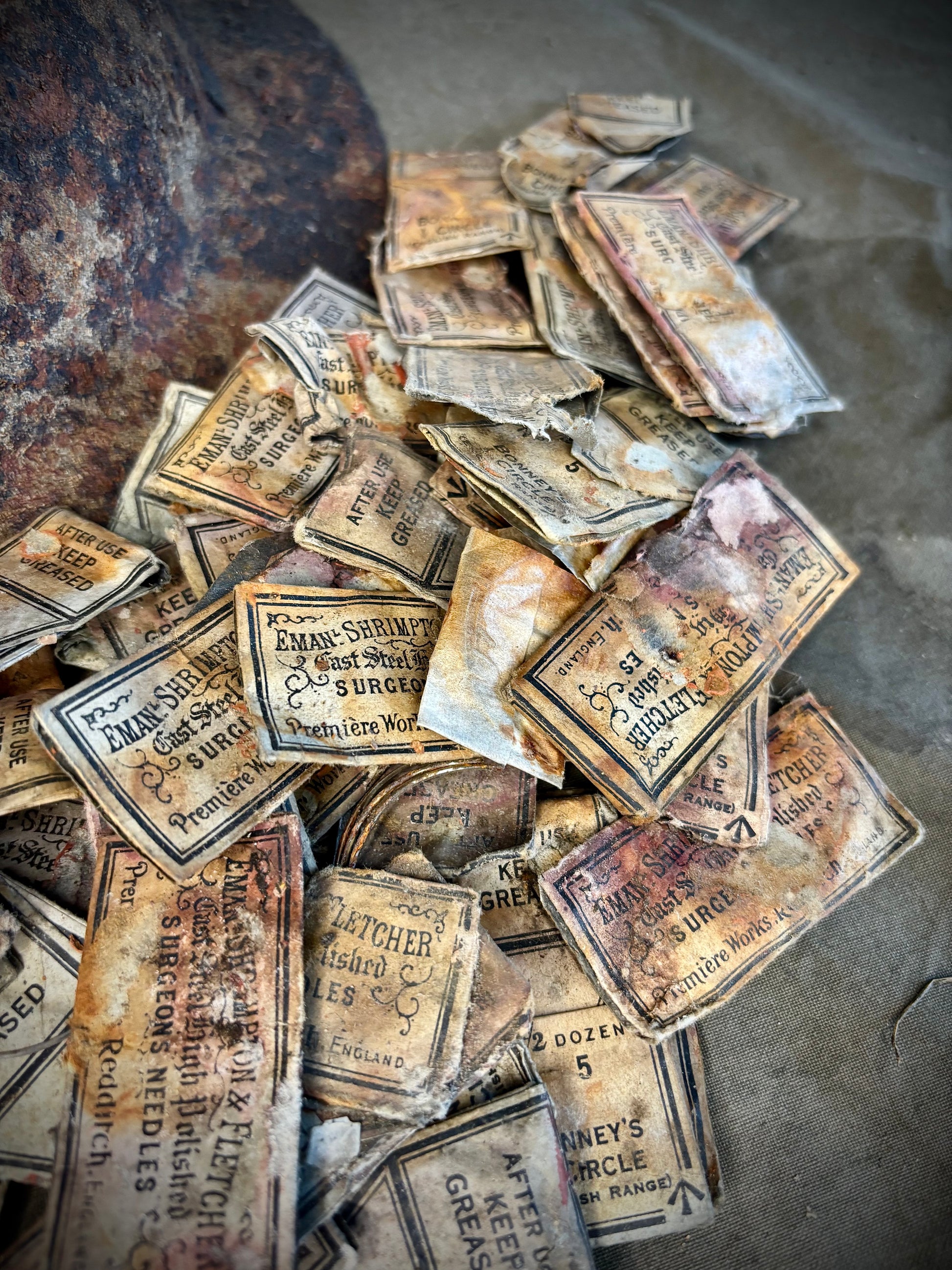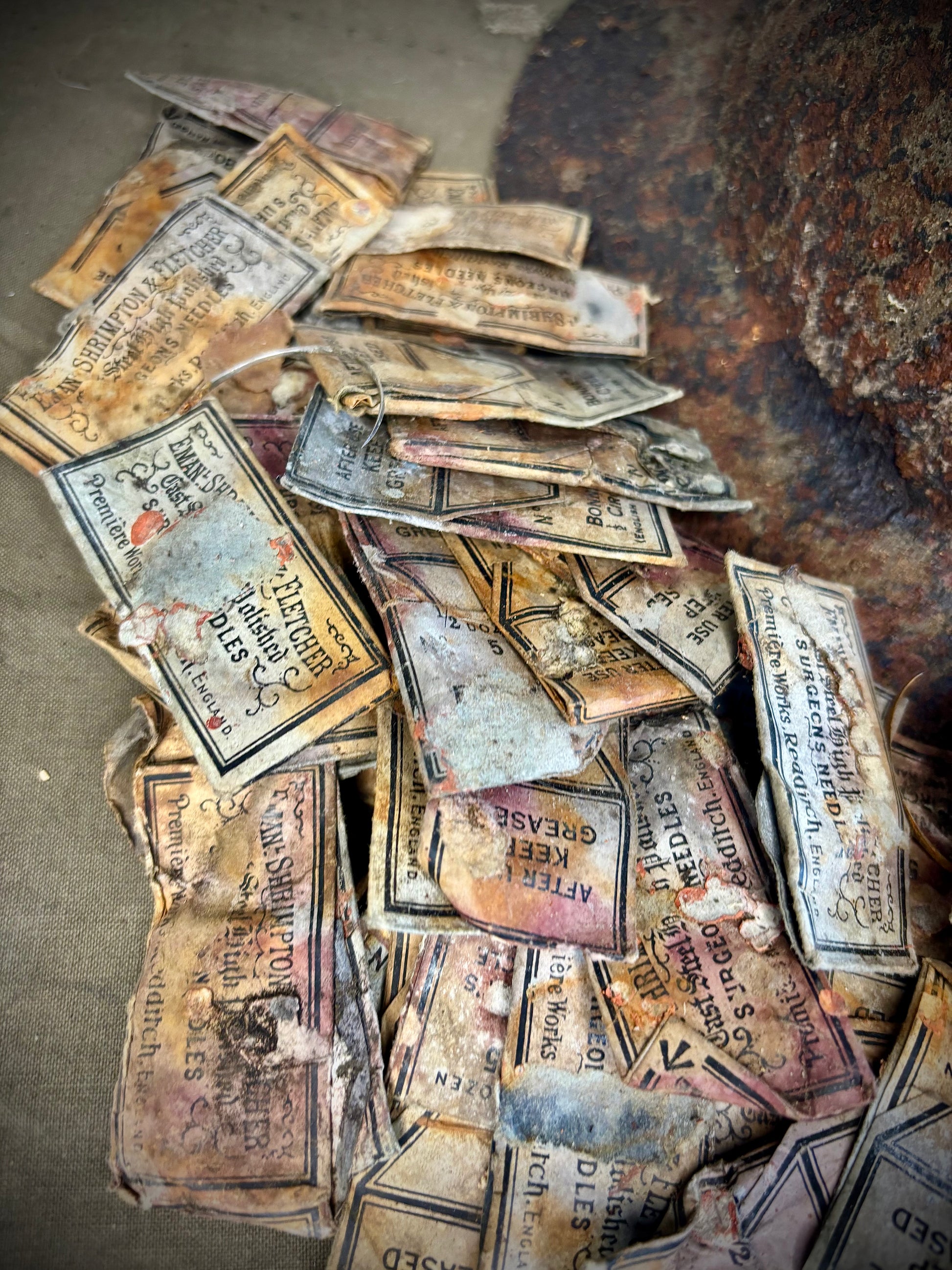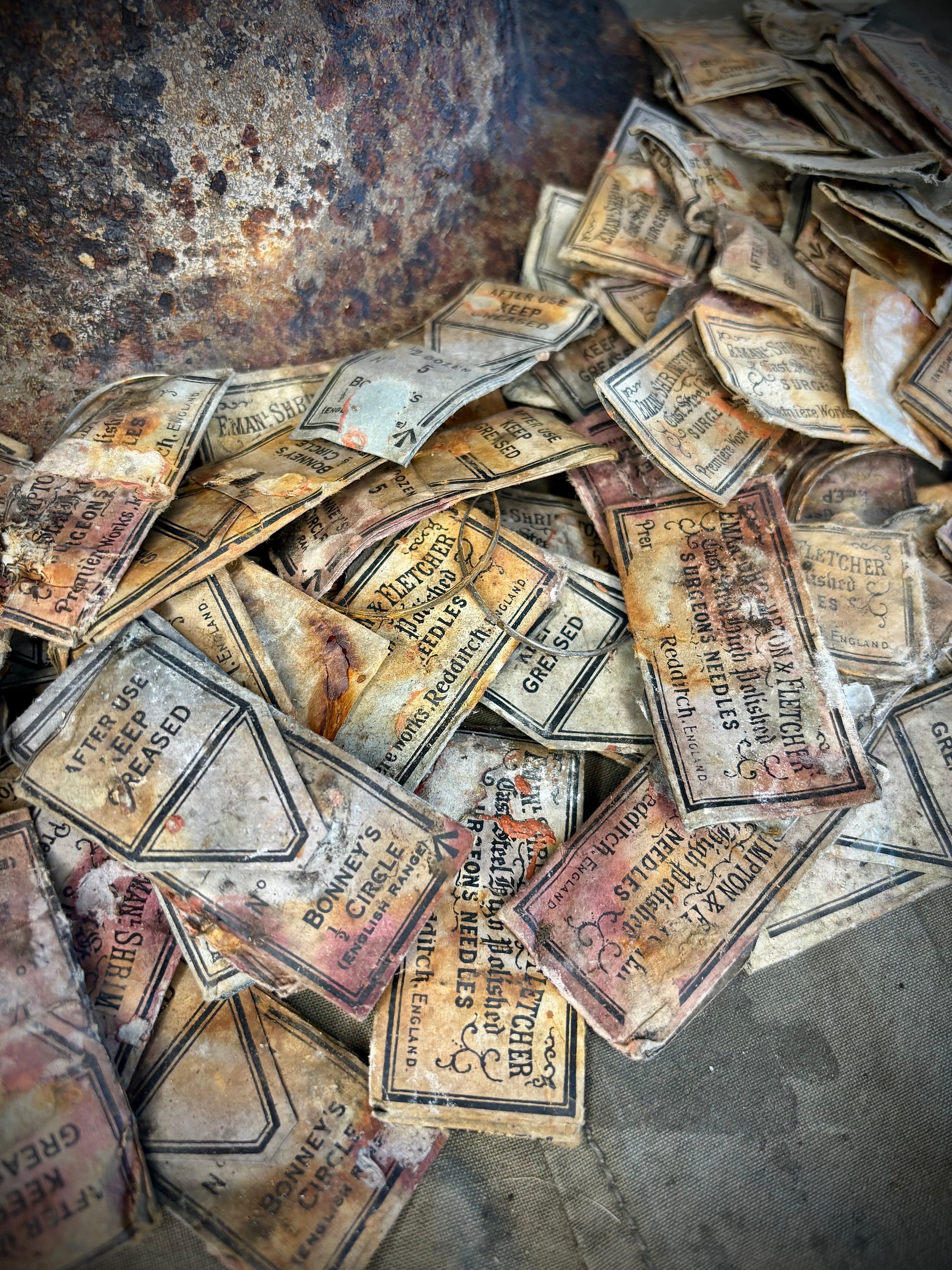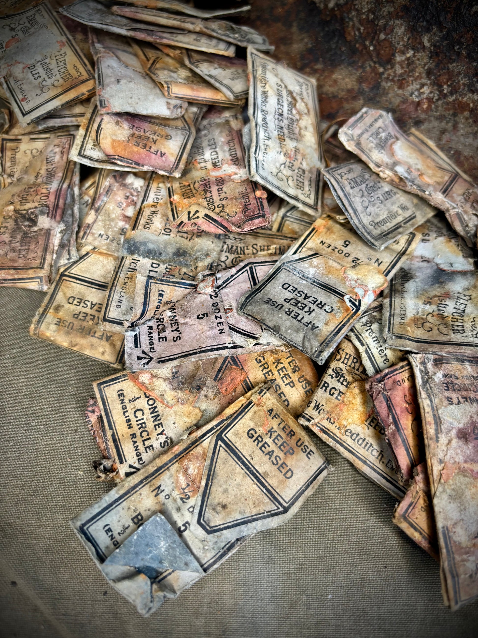 These WW1 British surgical needles were found in a loft in the town of La Boiselle around twenty years ago. Due to the packages being made of paper they are in poor condition however this is understandable do to the history. Most packets till contain the needles inside