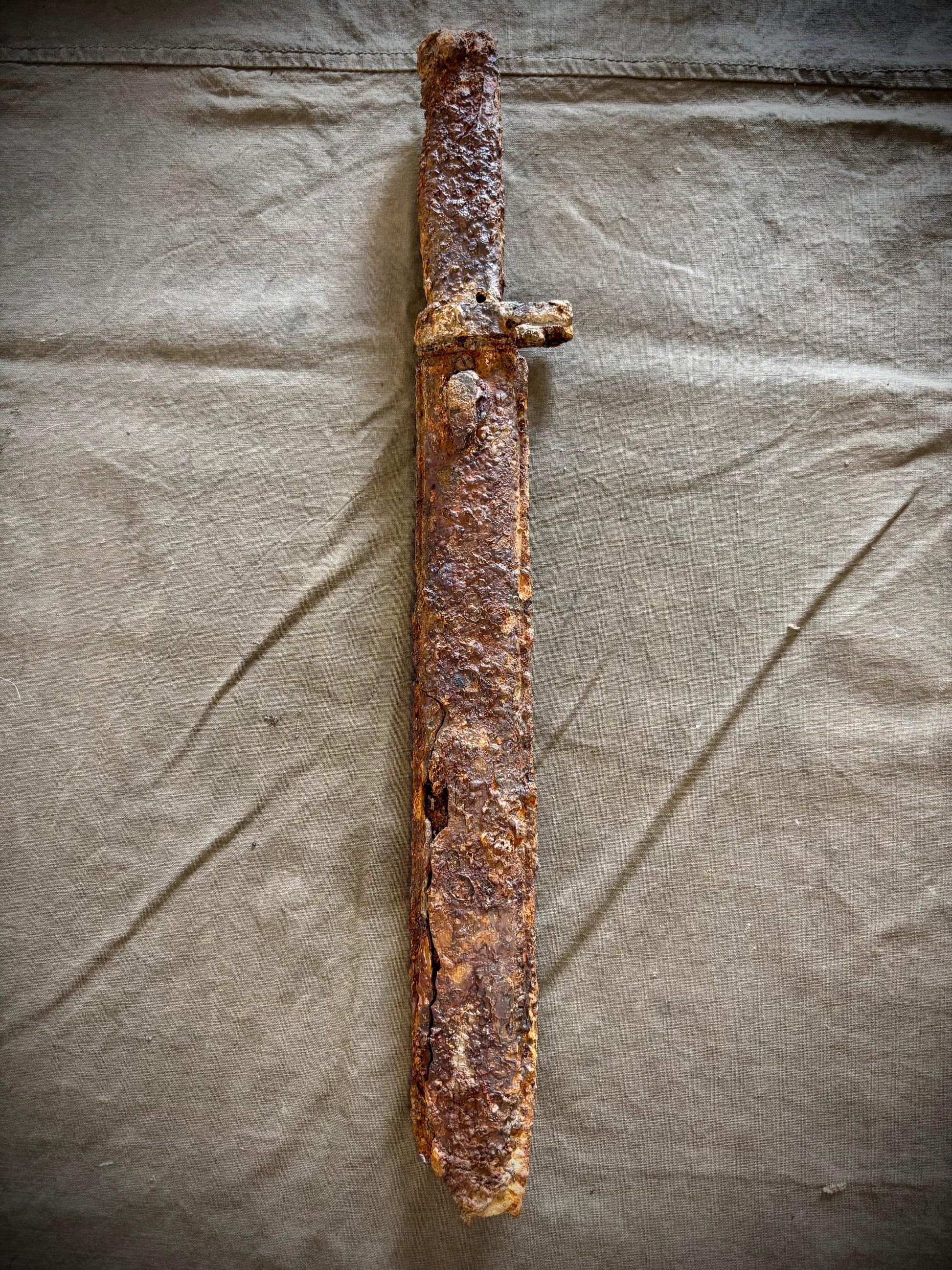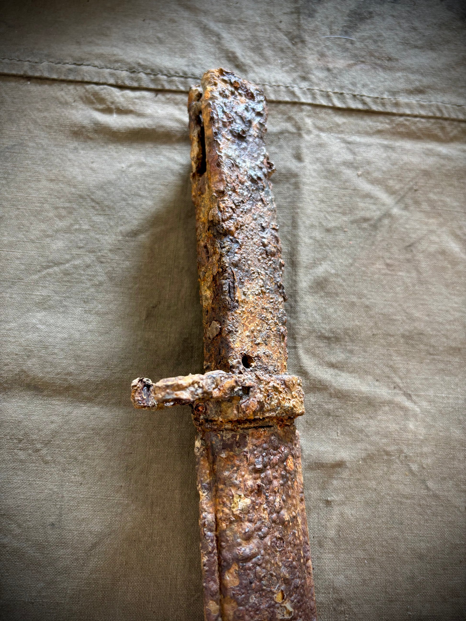 WW1 German Ersatz Bayonet found recently at the Ancre Valley in the scabbard. This incredible relic is in good condition considering how long it has been in the ground.