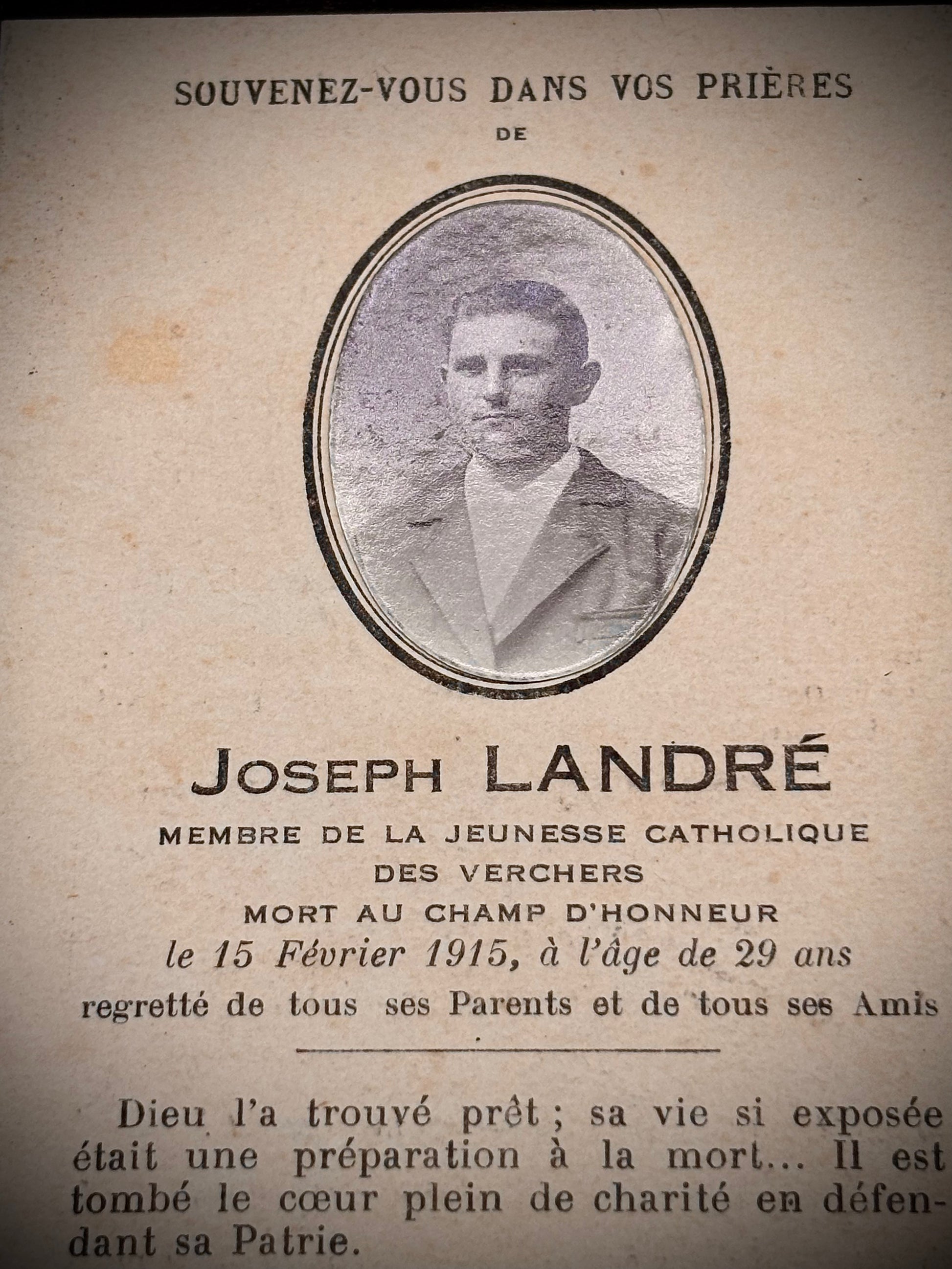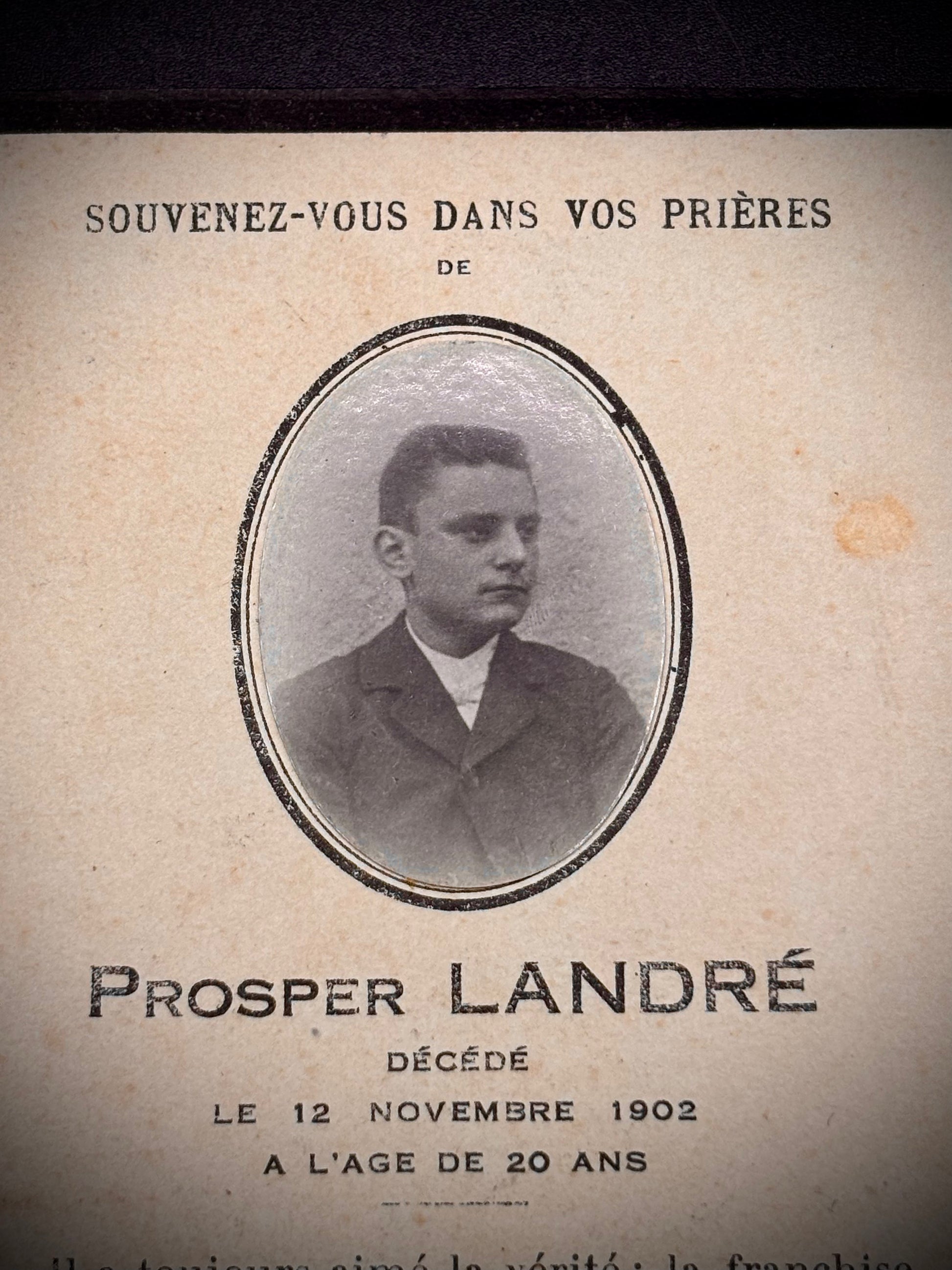 WW1 French memorial card honours two brothers, Joseph Landre was KIA on the 15th February 1915 aged 29 and his brother Prosper Landre who died on the 12th November 1902 aged 20.