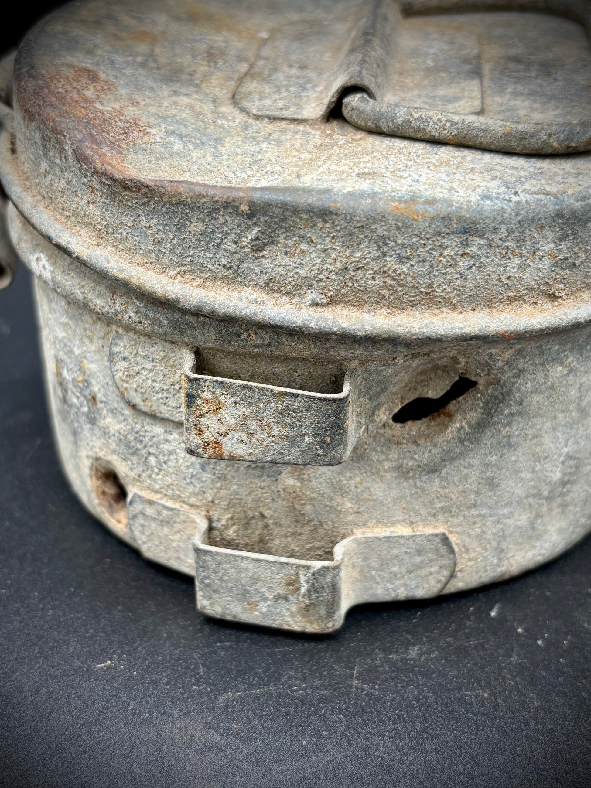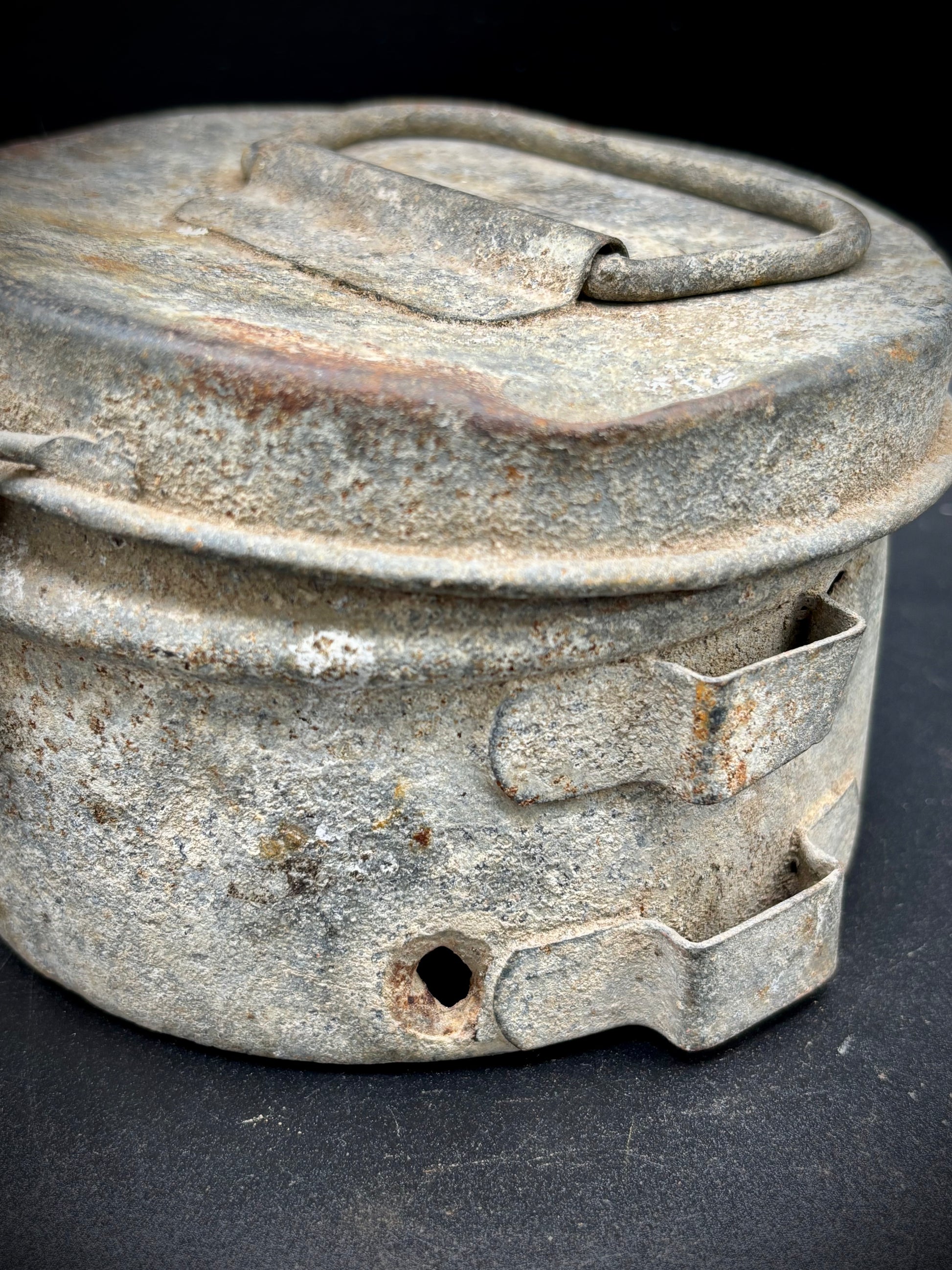 A very poignant relic that was found at Avaluy Wood in the Somme region of France showing the bitter fighting that occurred in the area. This is a nice solid relic and has clearly been found in a dry area showing little signs of rust. On one side there are two small holes from shrapnel. The tin was used to hold grease that would grease the working parts of artillery guns to prevent wear and tear.