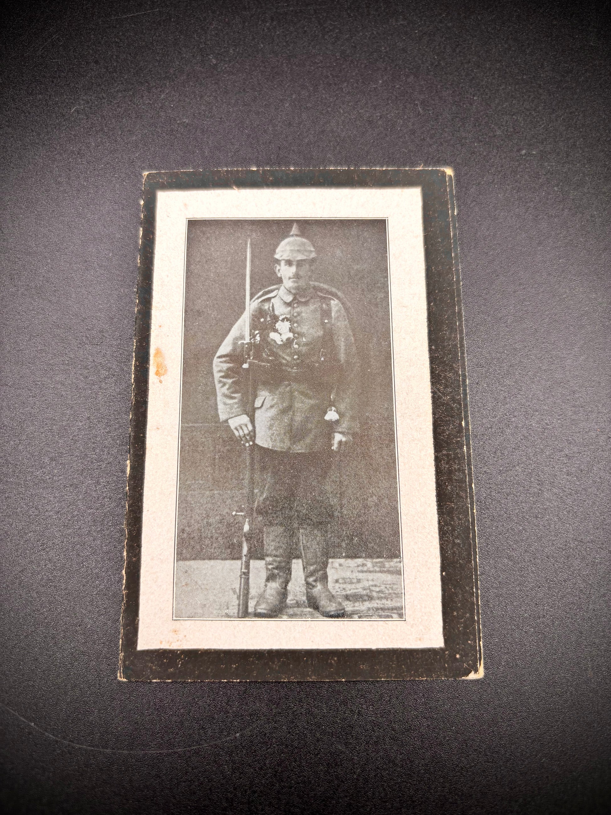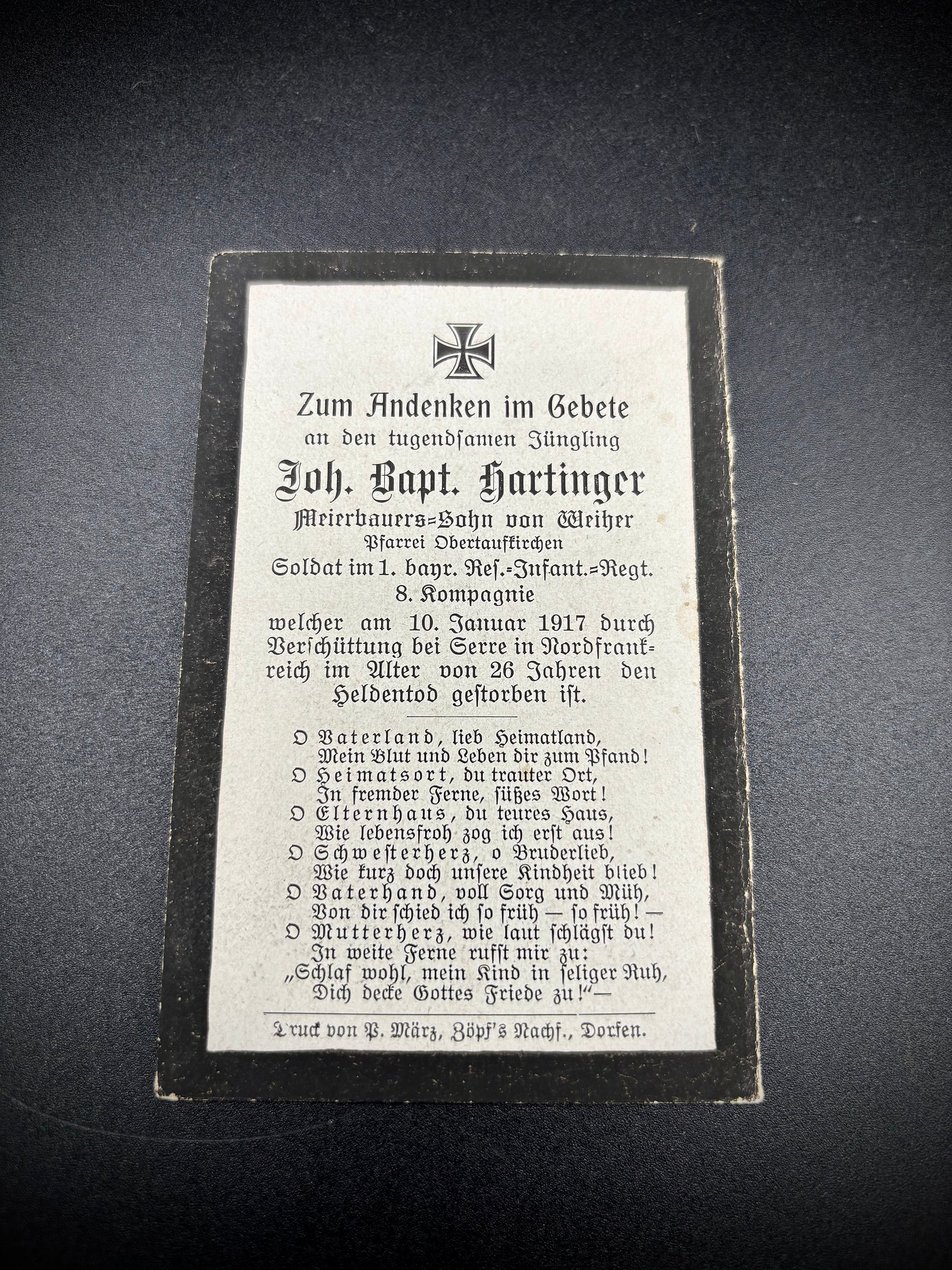 WW1 German memorial card which remembers Joh. Bapt Hartinger who was Meierbaur's son from Weiher and a soldier in the 1st Bavarian Reserve Infantry Regiment 8th Company. He was killed near Serre in the Somme region of France aged 26.