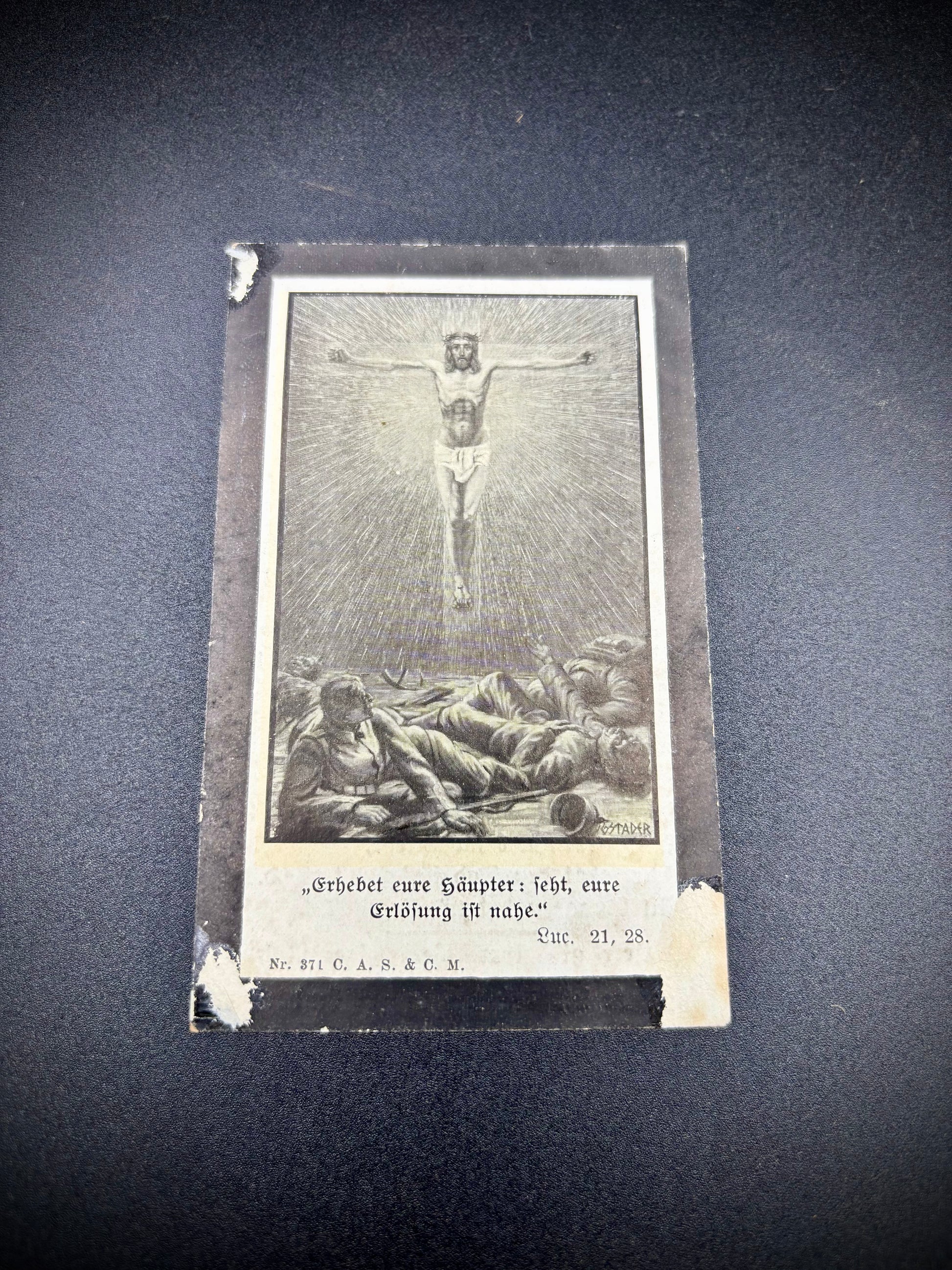 WW1 German memorial card which remembers Johann Huber, Farmers son in Unterradlsbach who served in the Royal 2nd Infantry Regiment. He died on the 24th May 1915 aged 24 on an outpost near Mametz (Somme).