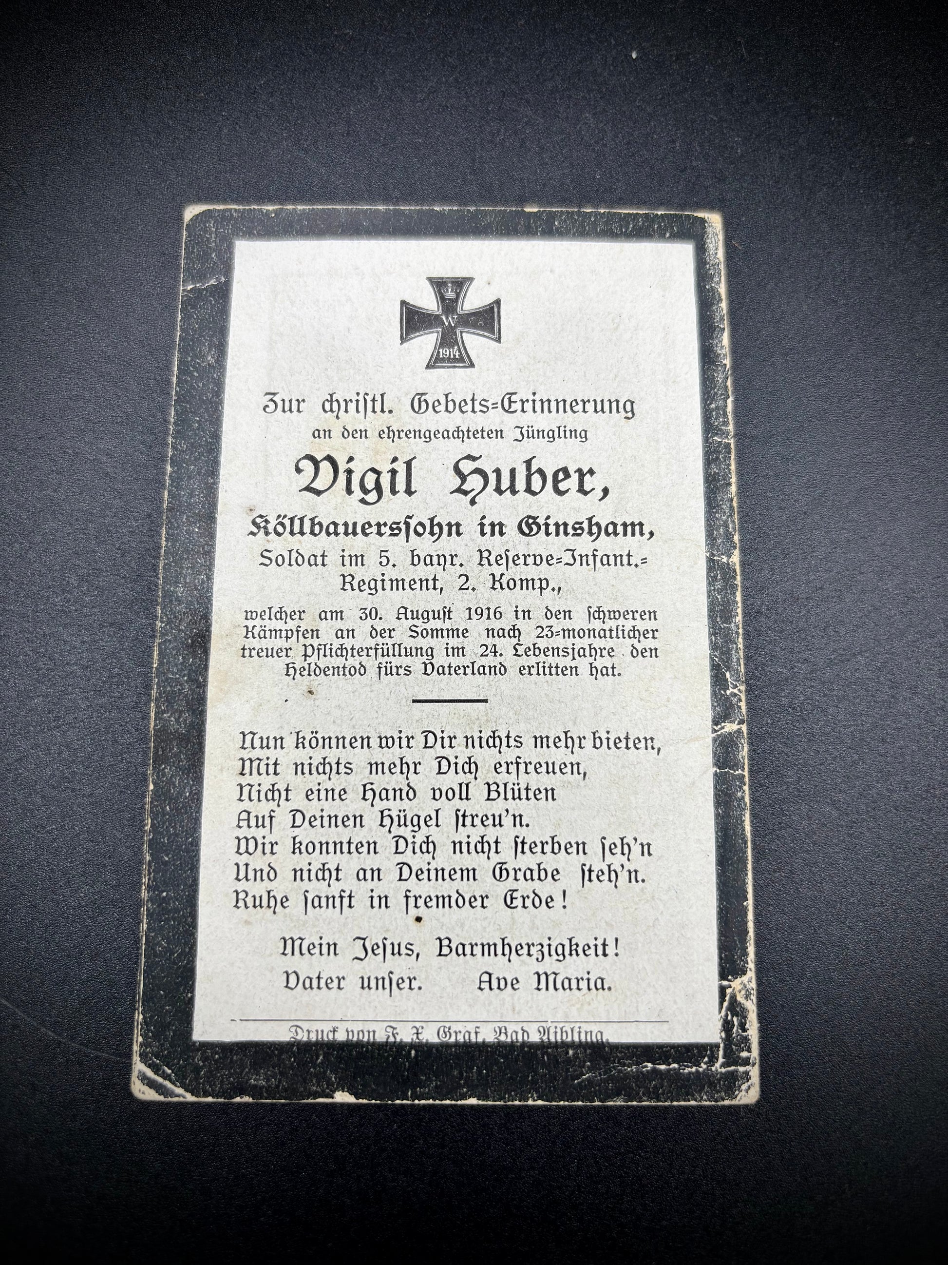 WW1 German memorial card remembering Vigil Huber who was a son of a farmer in Ginsham. He was a soldier of the 5th Bavarian Reserve Infantry Regiment 2nd Corps. On August 30th 1916in the heavy fighting on the Somme, after 23 months of faithful fulfilment of duty, suffered a heroic death for his fatherland at the age of 24.