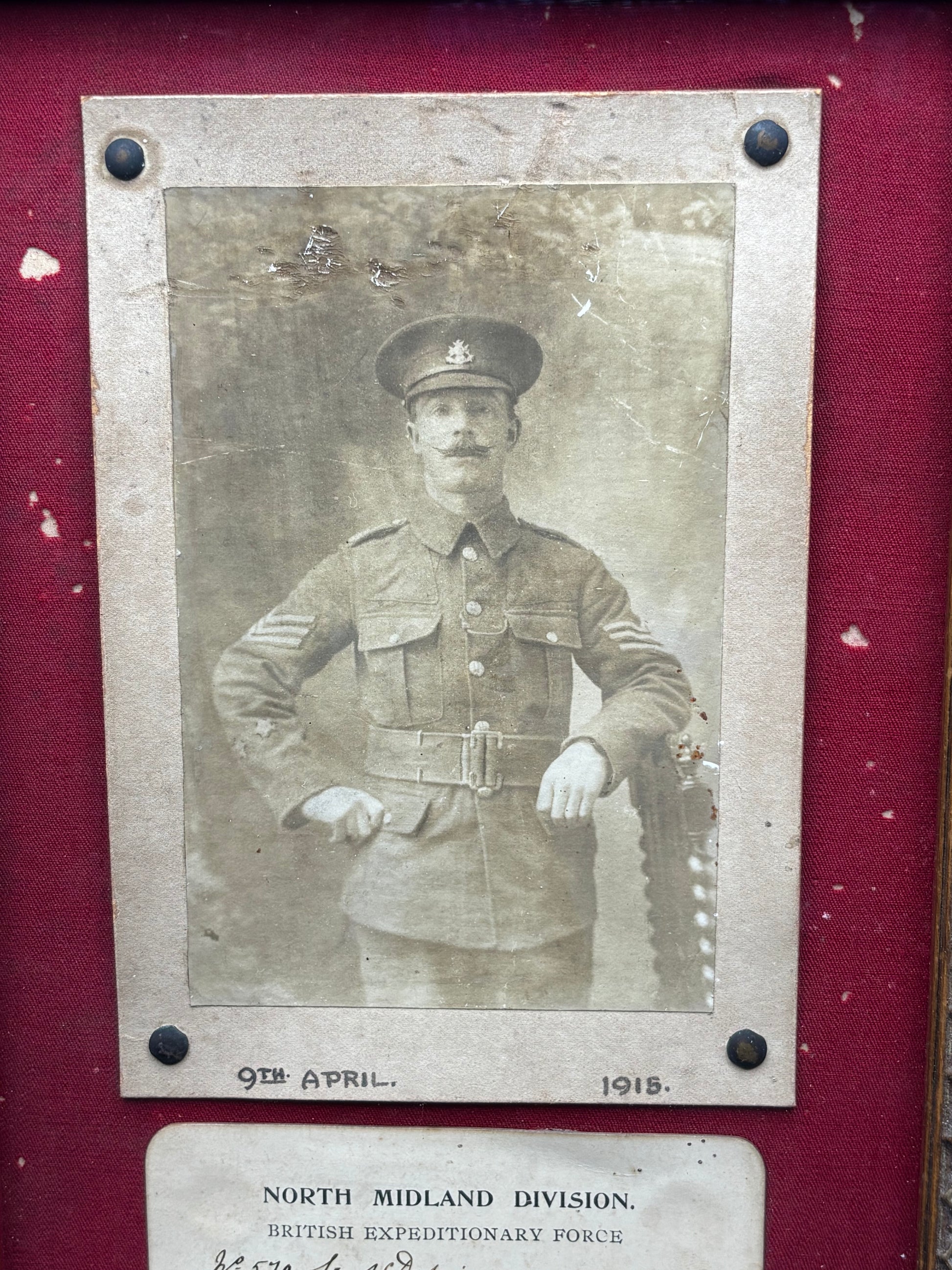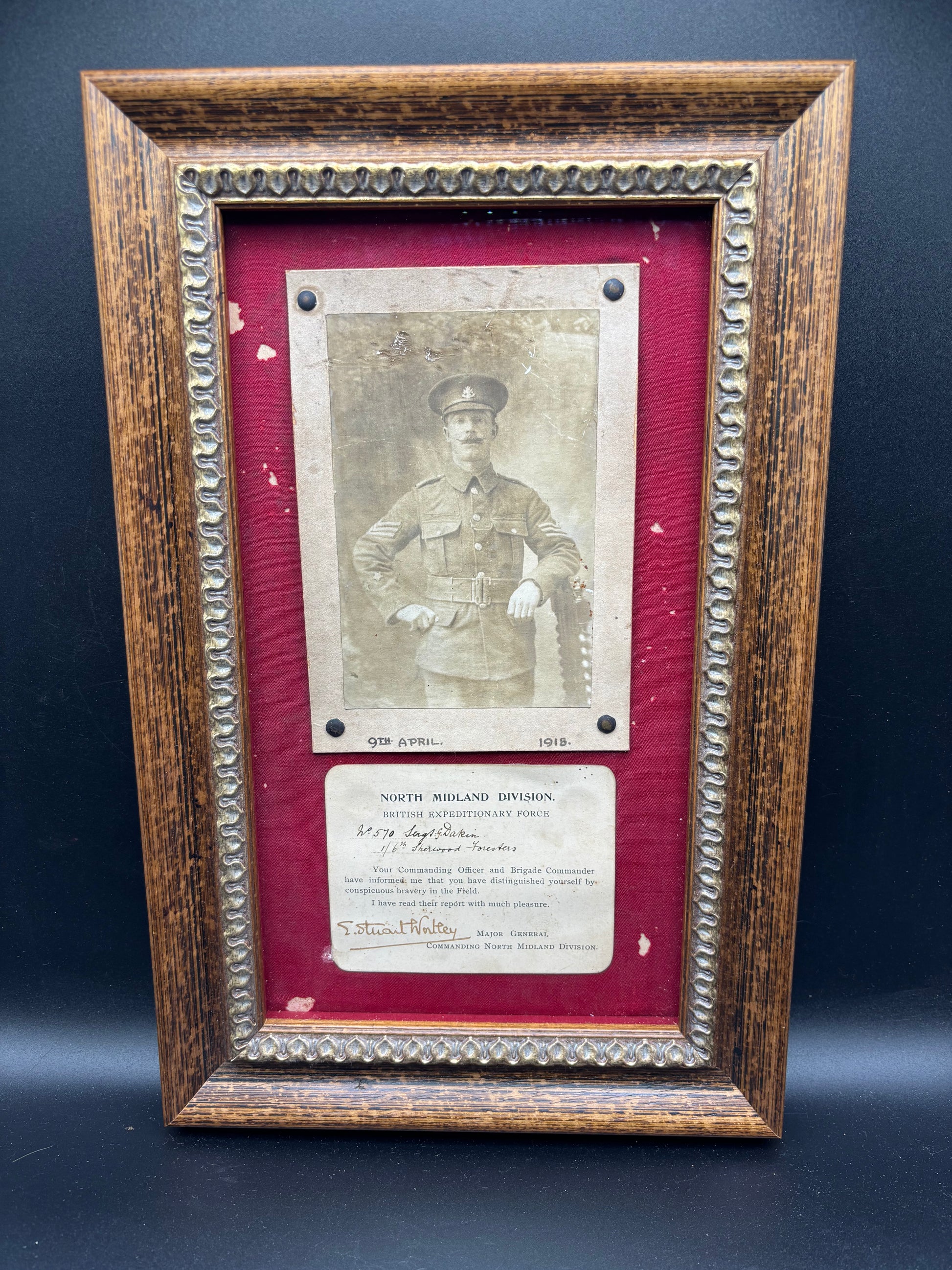 An incredibly rare signed certificate of bravery awarded to Sgt Dakin of the 1/6th Sherwood Forresters together with a photograph of him dated 9th April 1915. What is particularly special is that the certificate has been signed by Sir Stuart Wortley who was the commanding officer of the 46th Division and was the only divisional commander to be sacked after the 1st July 1916 and was blamed unfairly for a 'lack of offensive spirit'. The red surround has some moth damage and the picture has clearly been poorly stored over its time however I have had to framed and protected for future generations.