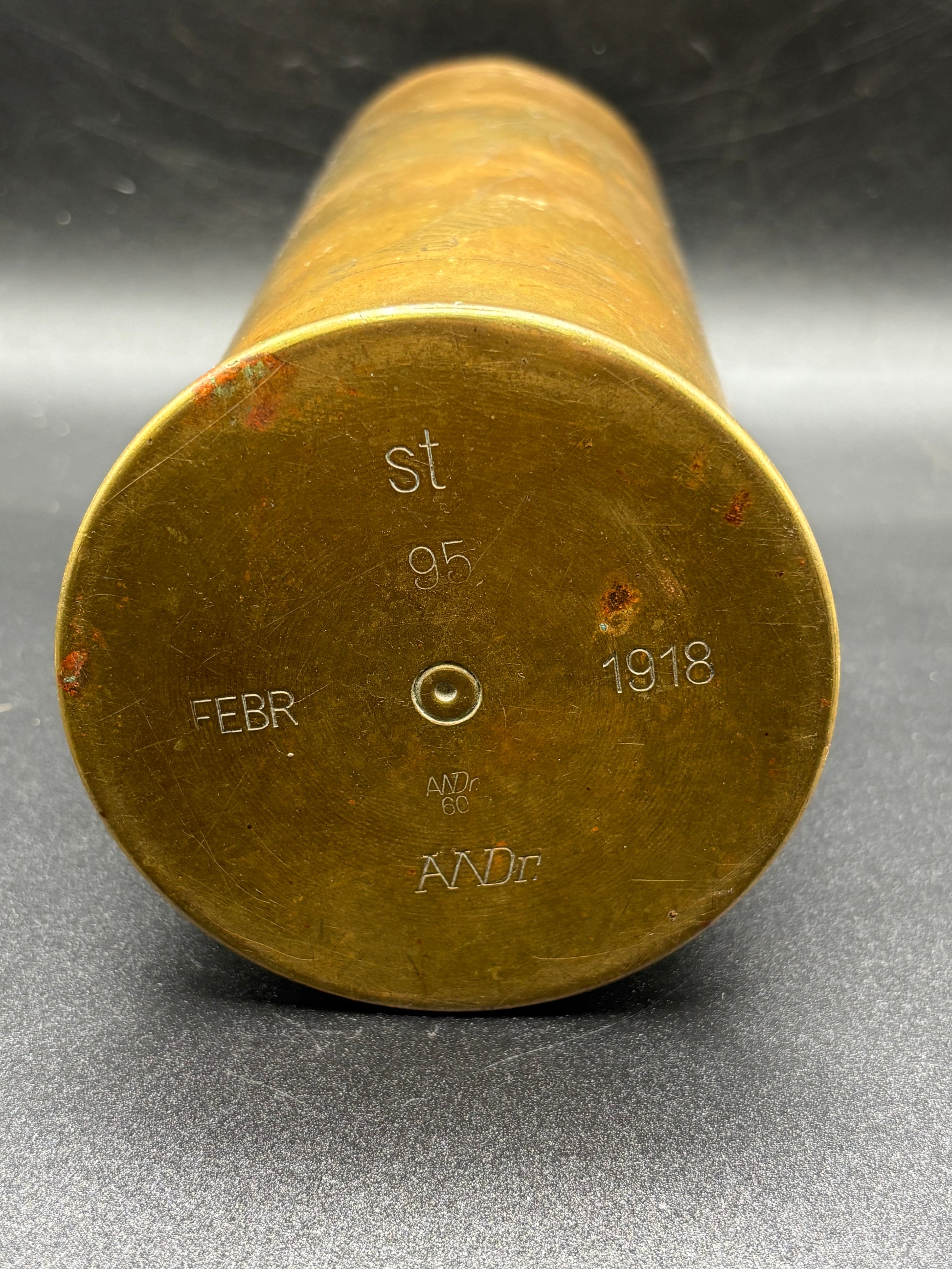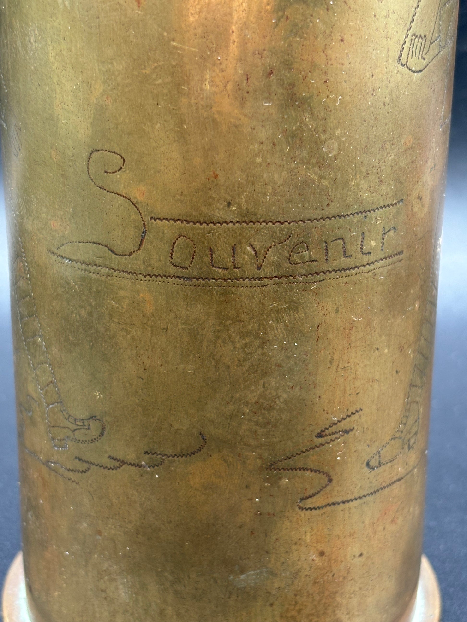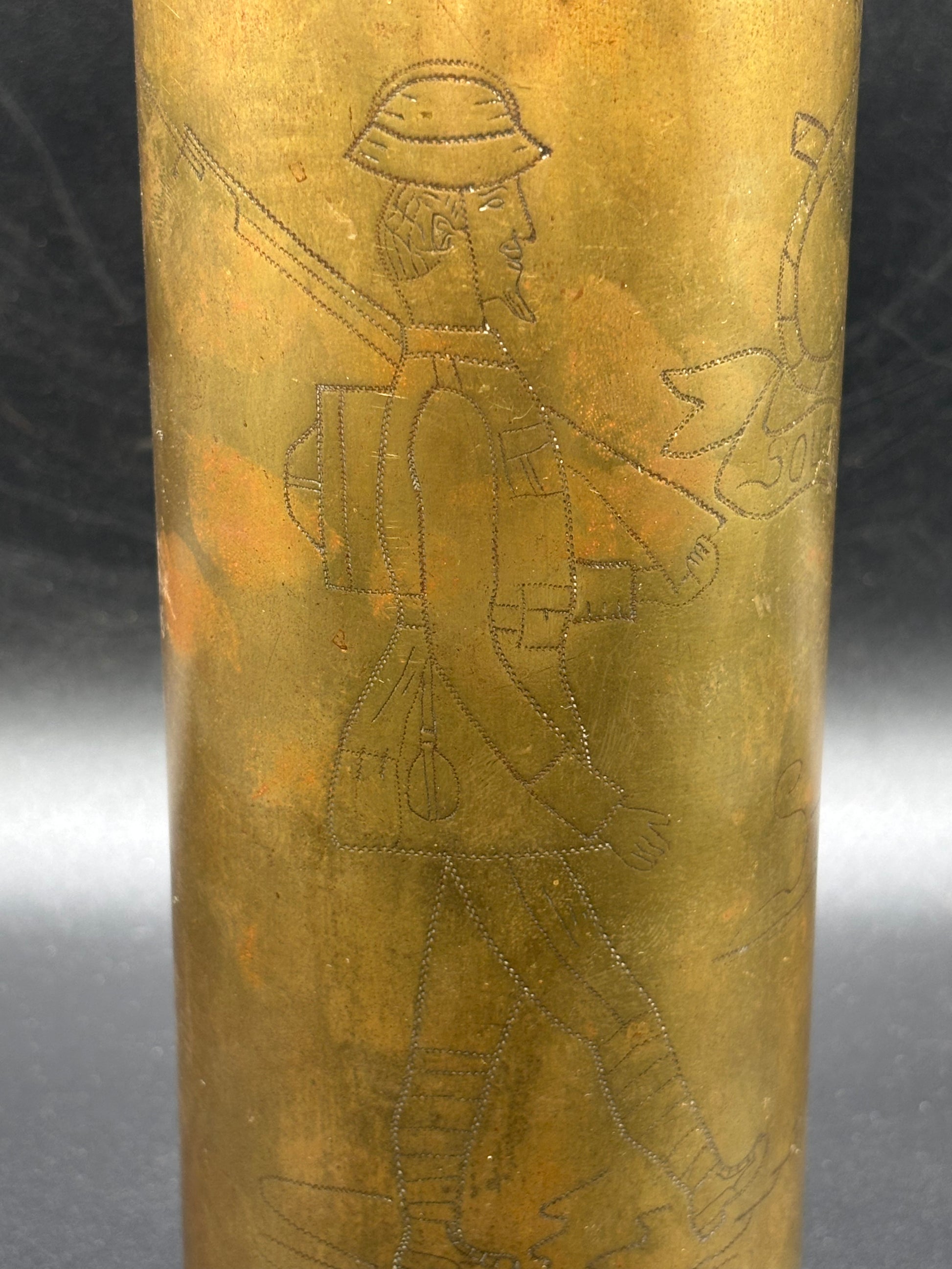 A lovely trench art German shell case that has been captured and engraved with the South Staffordshire cap badge flanked by two British soldiers in full fighting order. This shell case has been very well engraved and well looked after over the years. Clearly it has been cleaned in the past and could do with a clean or leave it as it is, its up to you!