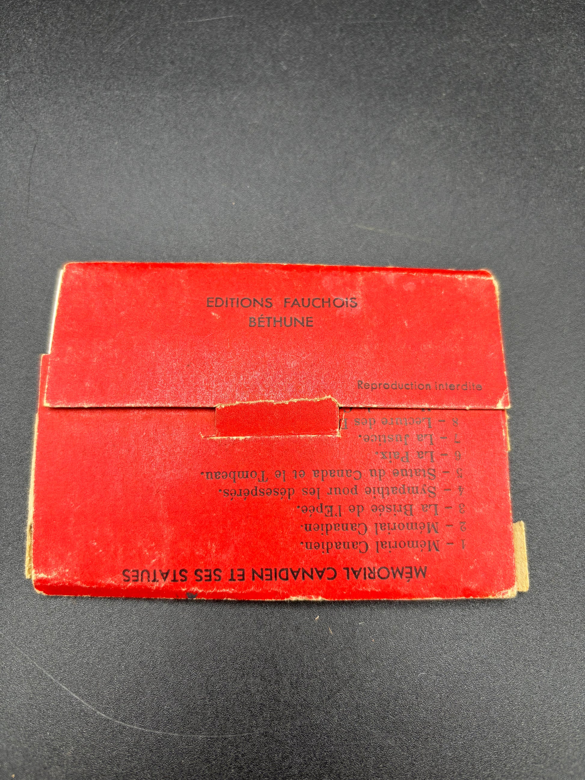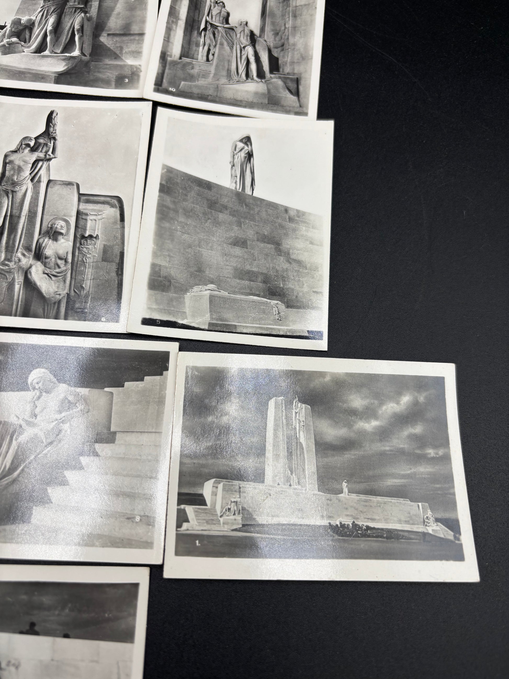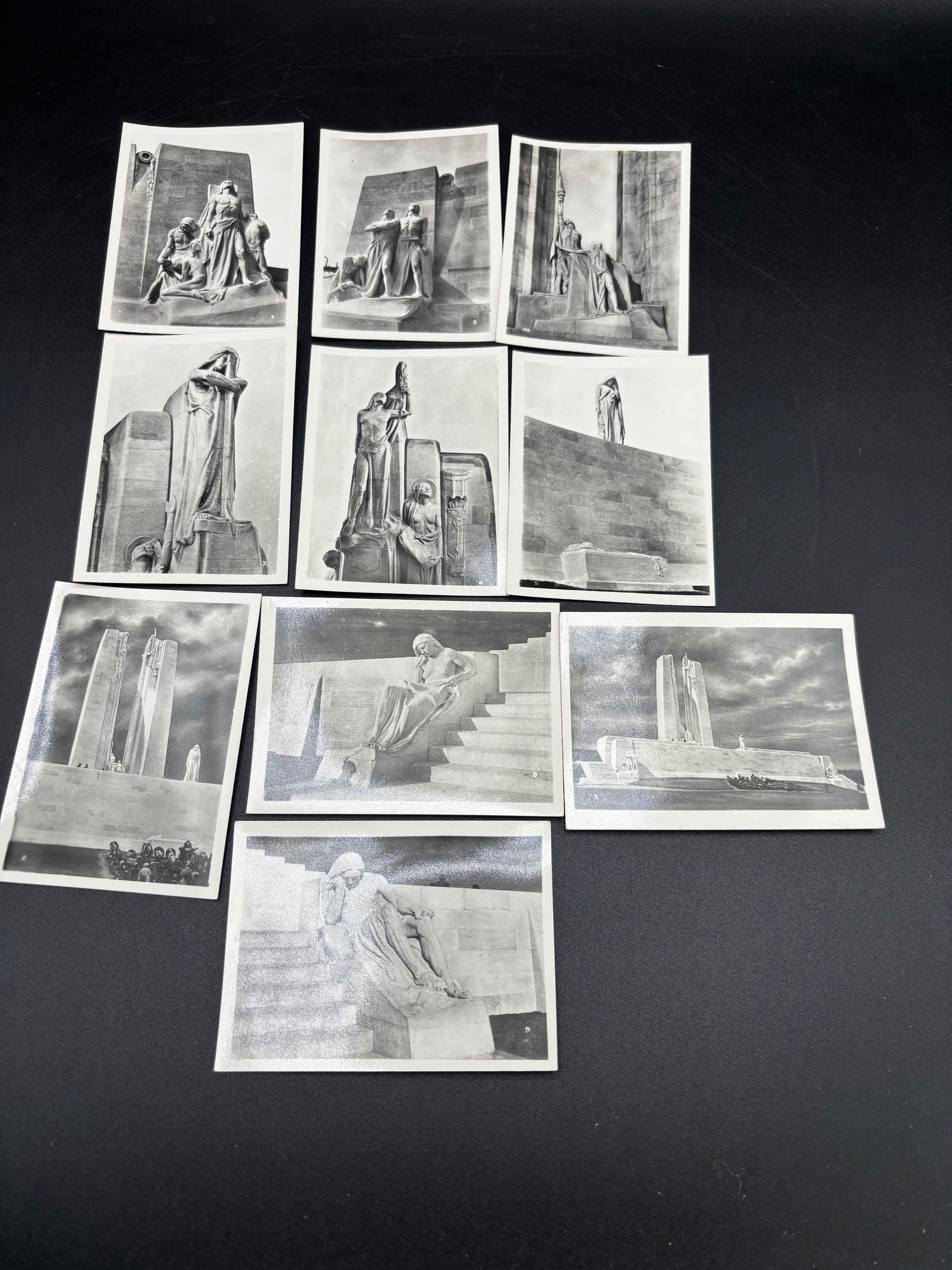 These sets of cards were sold to visitors and battlefield tourists during the 1930's or 40's as a souvenir of their visit. As far as I know the set is complete and show the Vimy Ridge memorial in great detail. The red card packaging has had wear from being stored over the years however it has protected the photographs over the years.