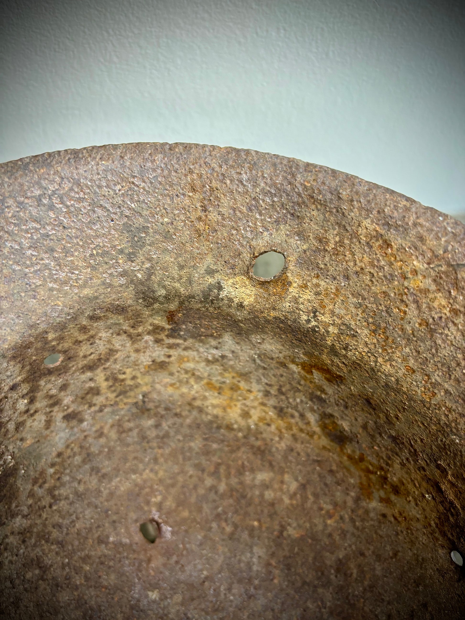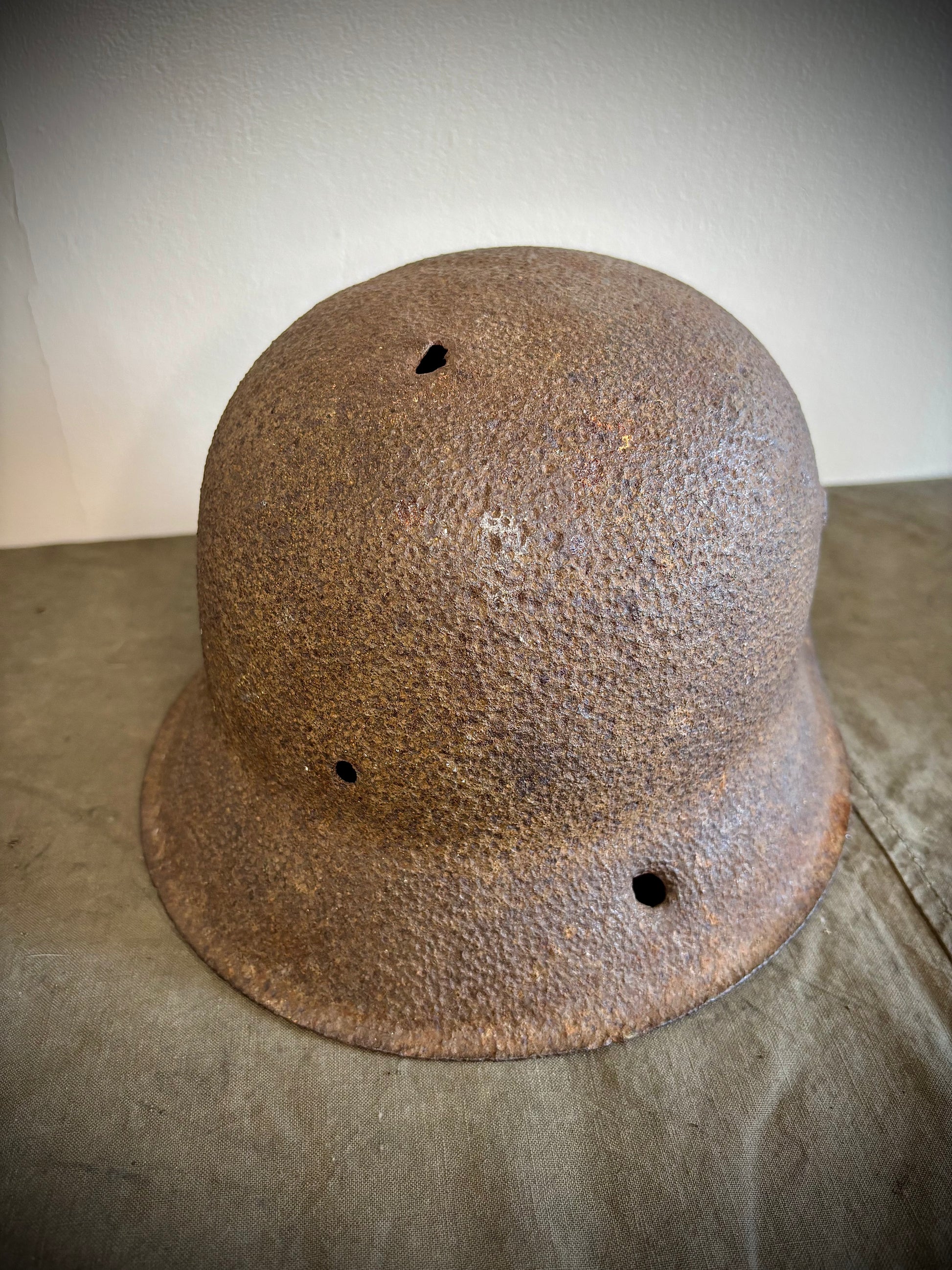 WW2 German helmet that was found in the Normandy bocage showing signs of a very intense battle. The helmet has suffered shrapnel damage and a bullet strike all around the helmet. Overall the helmet is in good solid condition seeing that it has been in the ground